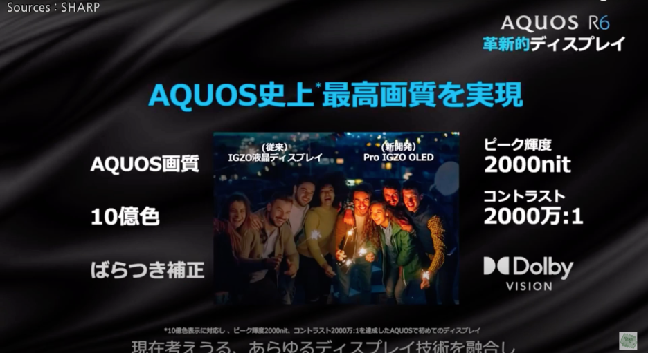 샤프는 이그조 디스플레이를 생산하고 있는데요. 아쿠오스 R6에는 이그조 기술을 사용한 OLED 디스플레이를 탑재했습니다. 샤프에서는 프로 이그조 올레드라고 부른다네요.