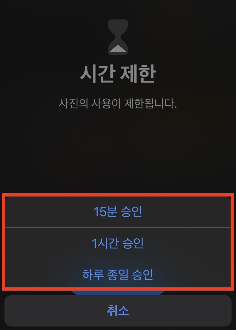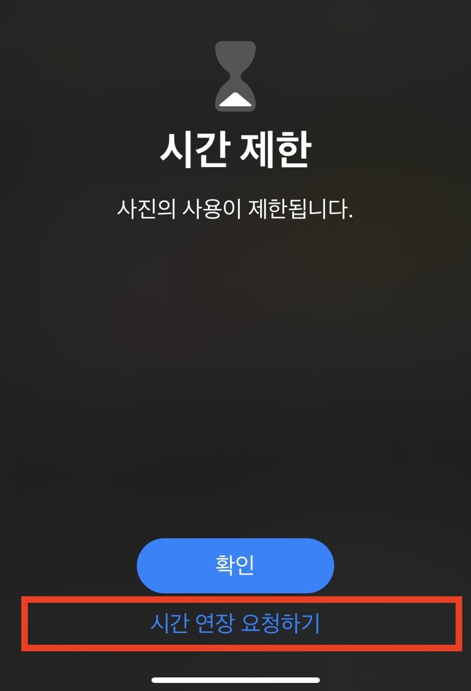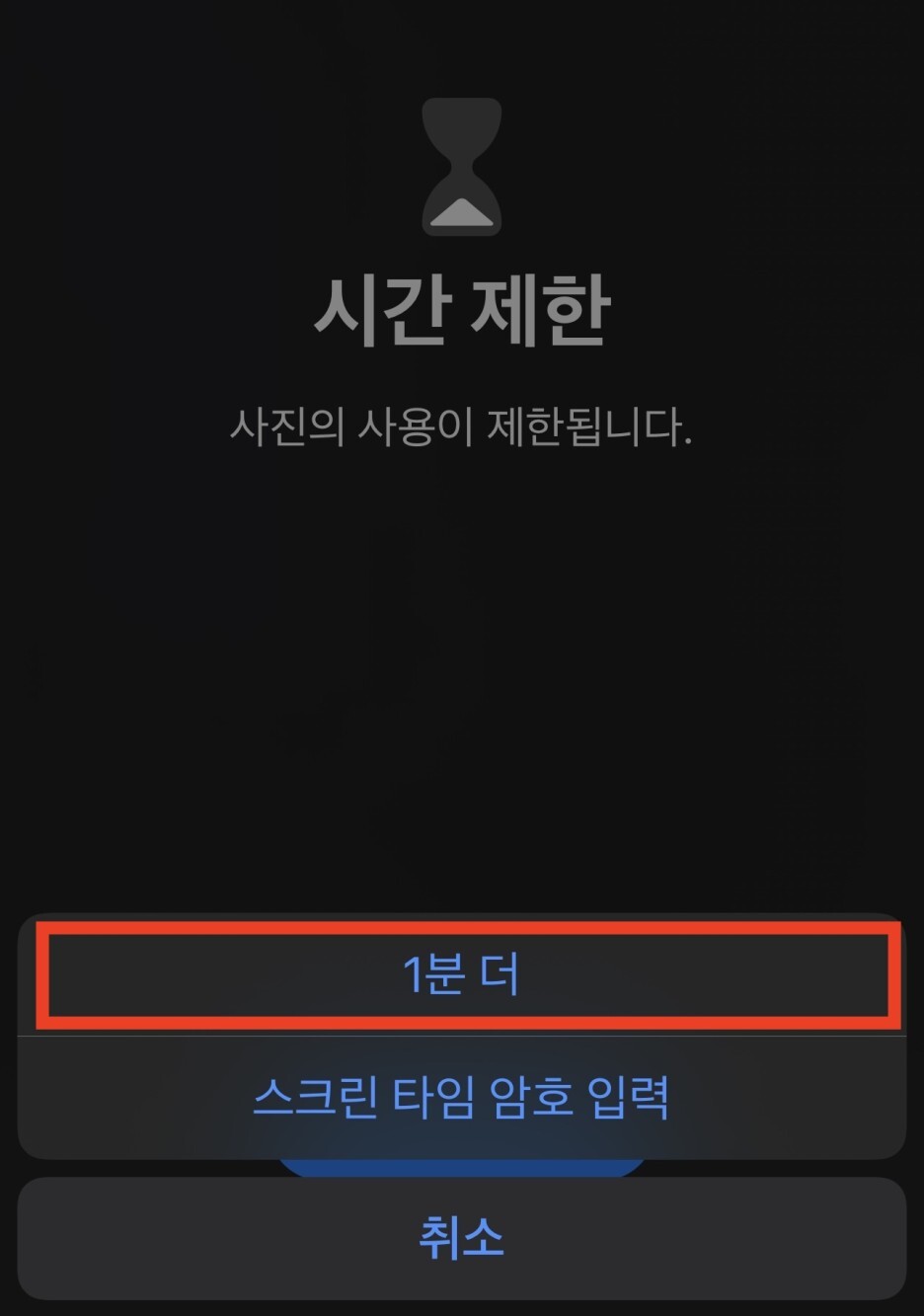 따라서 스크린 타임 - 앱 시간 제한을 통해서 사진 어플을 추가하셨다면, 가장 먼저 사진 어플을 여시고 '1분 더'를 눌러 어플을 1분 동안 켜주시면 1분 뒤 자동으로 어플이 잠깁니다.