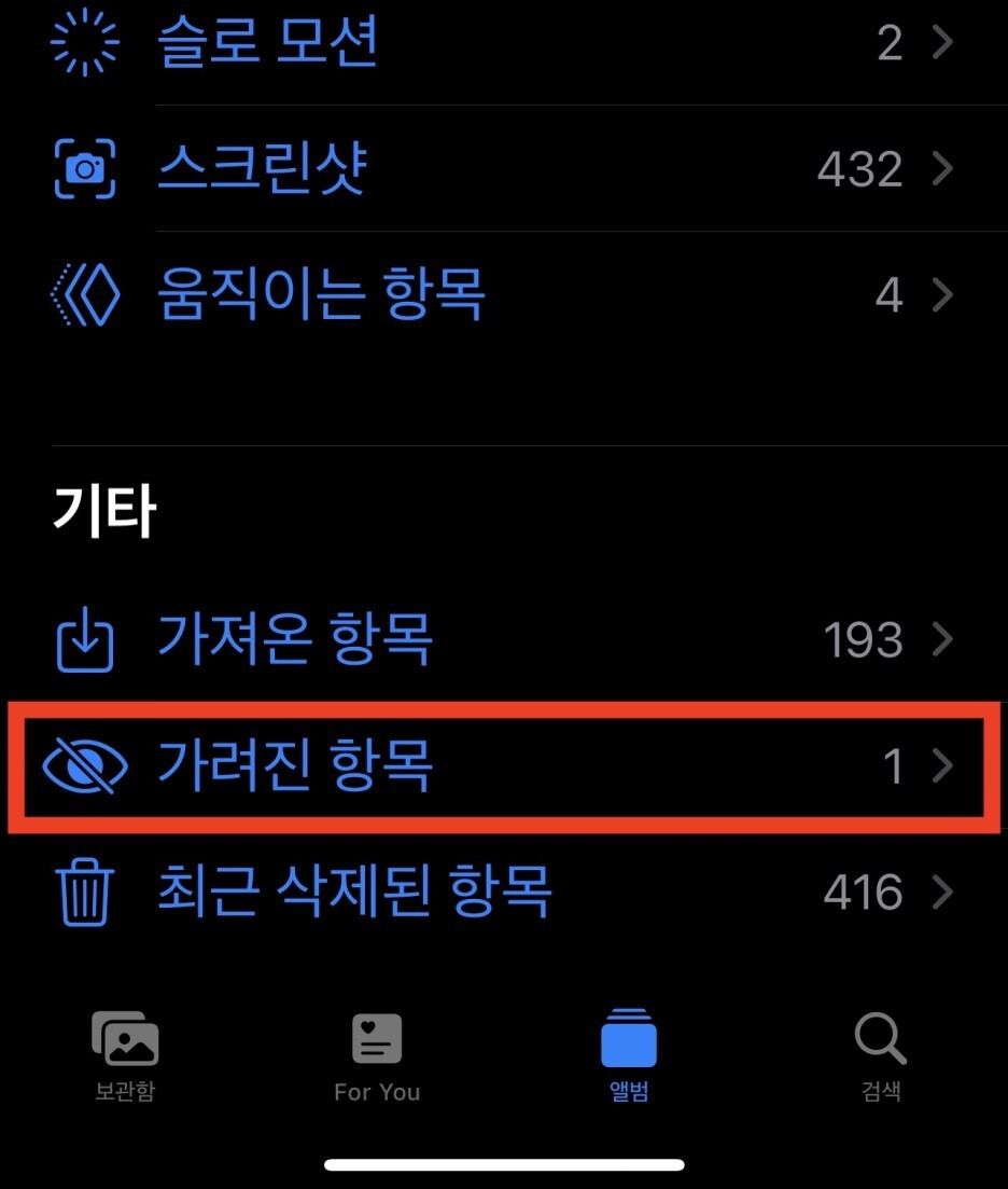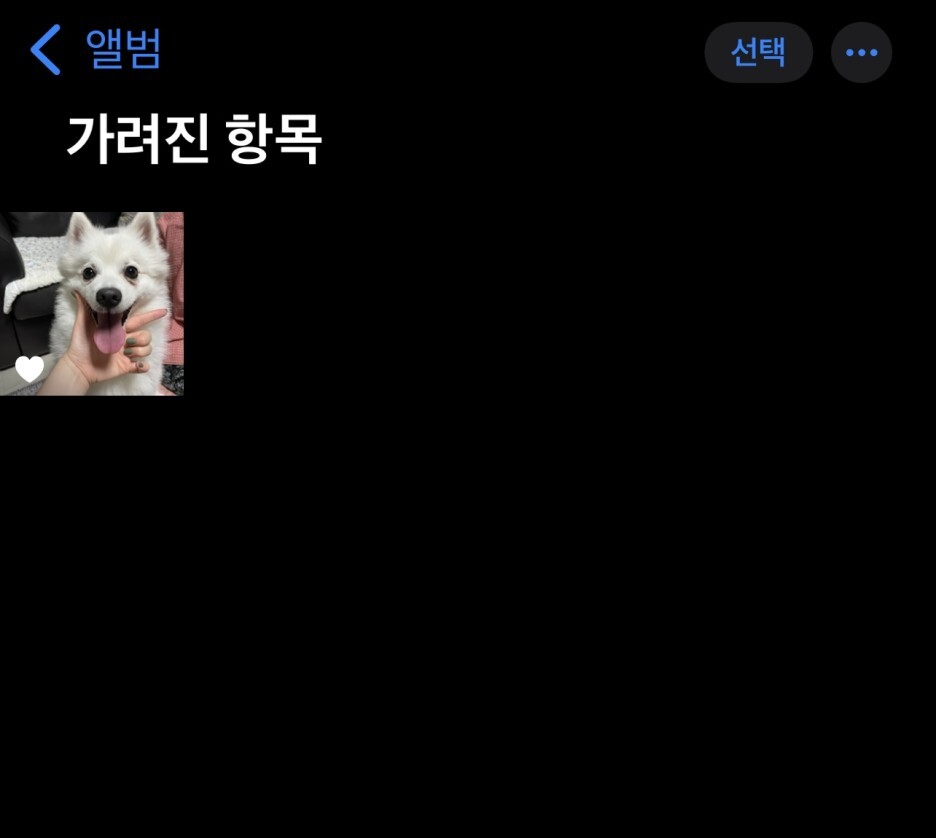그럼 사진 어플에서 '가려진 항목'이 더이상 보이지 않습니다. 그러나! 우리가 원하는 건 사진을 숨기는 것이 아니라 다른 사람이 내 사진을 아예 볼 수 없게 잠가버리고 싶은 거 아니겠습니까.