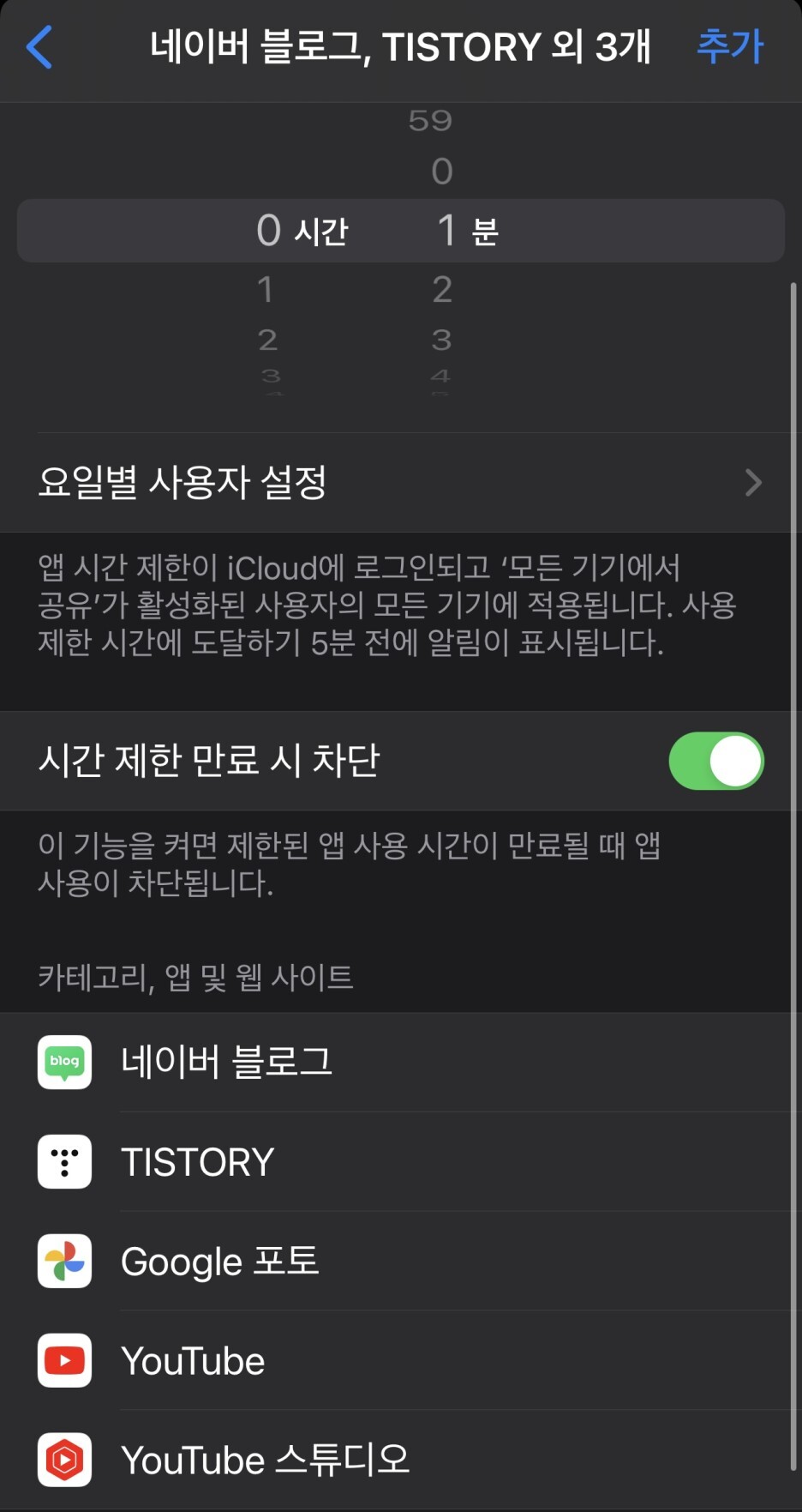참고로 앱 시간 제한 체크를 해제했다가 다시 켰을 때, 잠긴 어플에서 '1분 더' 부분을 미리 하셨다면 어플은 자동으로 잠겨있습니다.