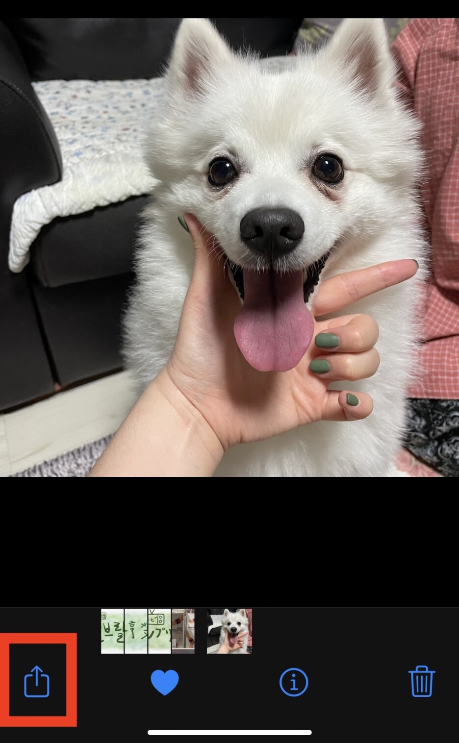 먼저, 사진 숨기는 방법 간단하게 알려드릴게요. 숨기고 싶은 사진을 눌러 주시고 왼쪽 아래 있는 공유 버튼을 눌러주세요.