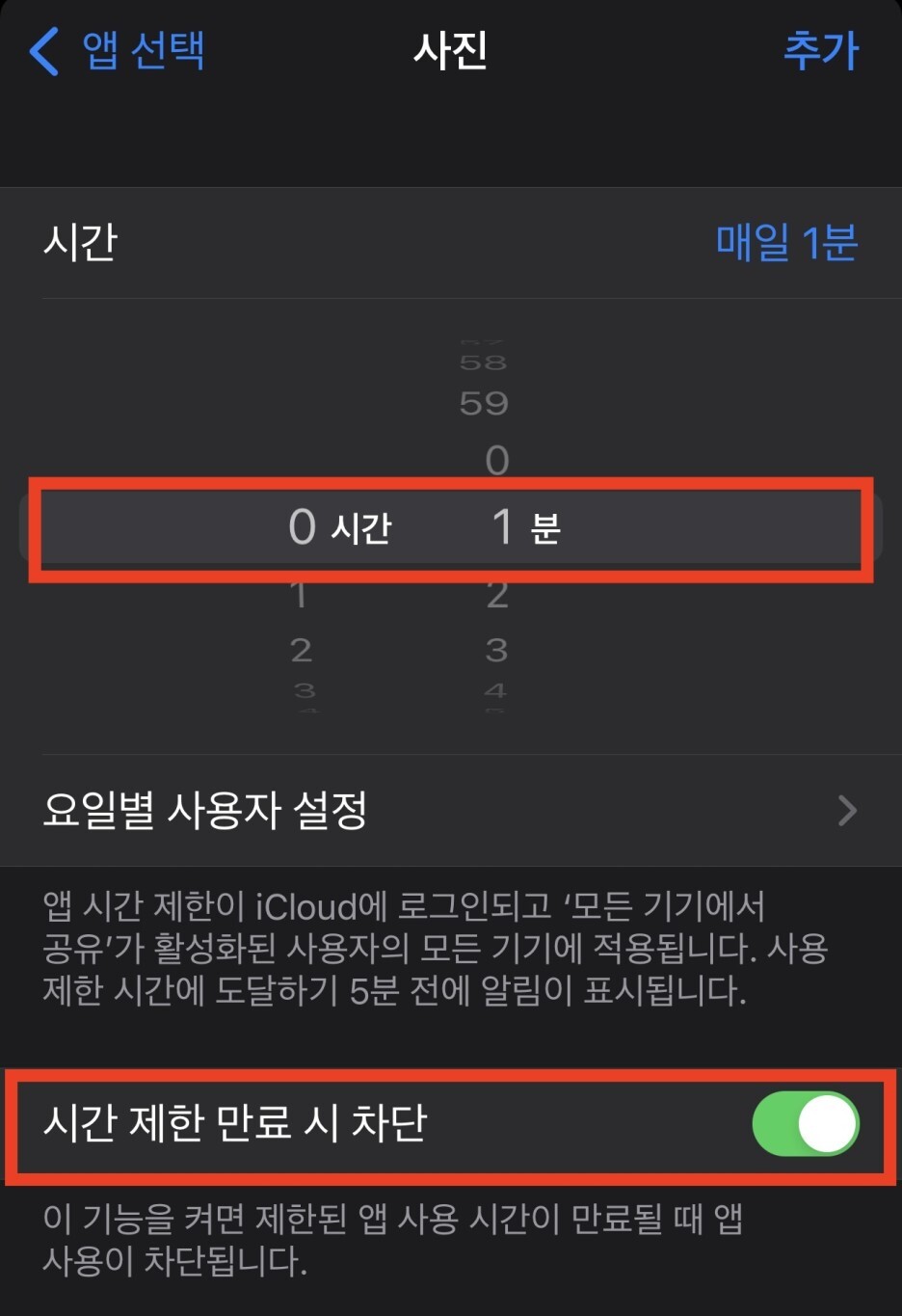 사진 어플을 추가하시면 시간을 설정해줄 수 있는데요. 1분으로 설정해주시고, 밑에 '시간 제한 만료 시 차단' 꼭 체크해주세요!
