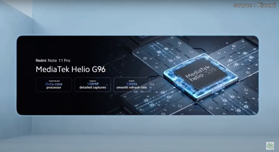 홍미노트11 프로는 미디어텍 헬리오 G96를 탑재했습니다. 120Hz 주사율과 블루투스 5.2를 지원하는 AP라고 합니다.