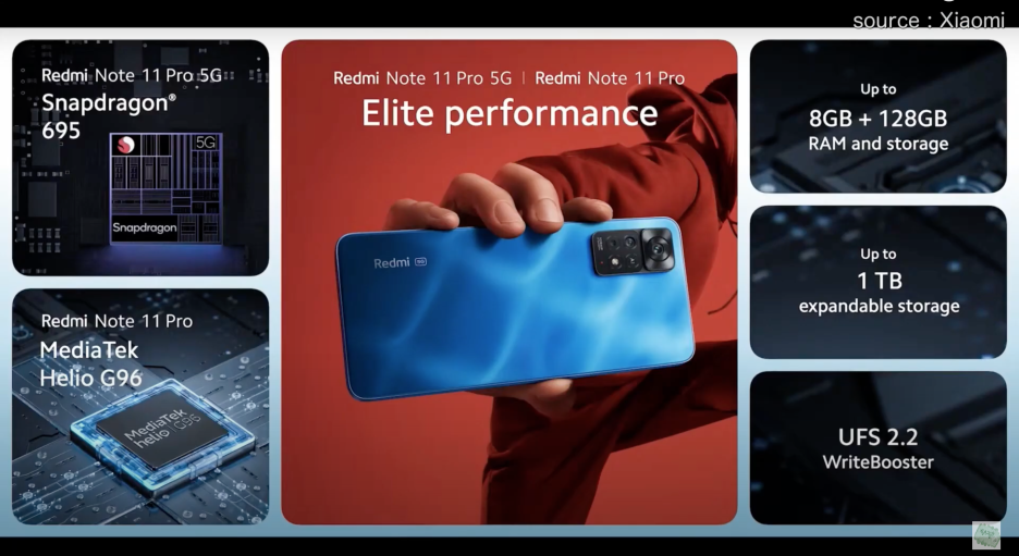 홍미노트11 프로, 11 프로 5G 모두 램은 6기가와 8기가, 스토리지는 64기가 128기가, SD카드는 1테라까지 지원합니다. 그리고 UFS 2.2로 읽기쓰기 속도는 나름 쓸만하겠네요.