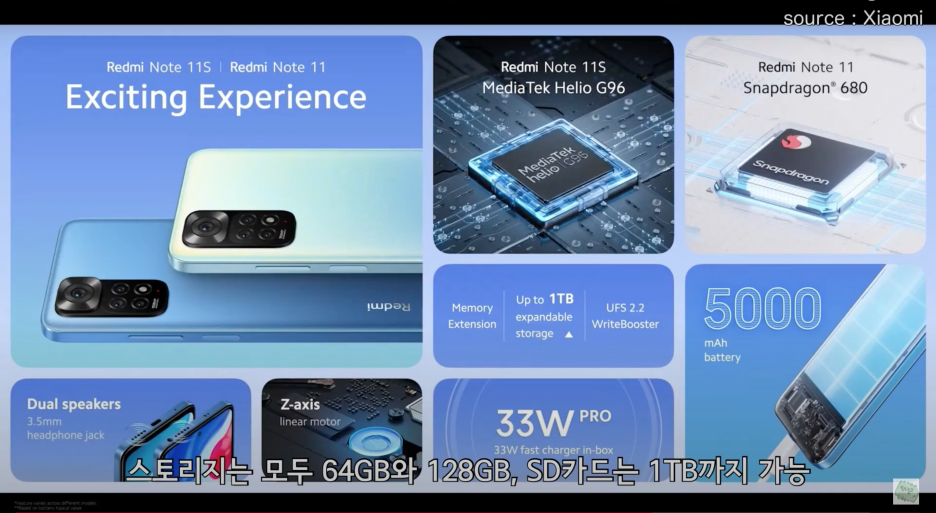 홍미노트11은 램 4기가와 6기가, 홍미노트11S는 램 6기가와 8기가, 스토리지는 모두 64기가, 128기가입니다. SD카드 역시 1테라까지 지원합니다. 역시 UFS 2.2으로 읽기쓰기 속도 쓸만해요.
