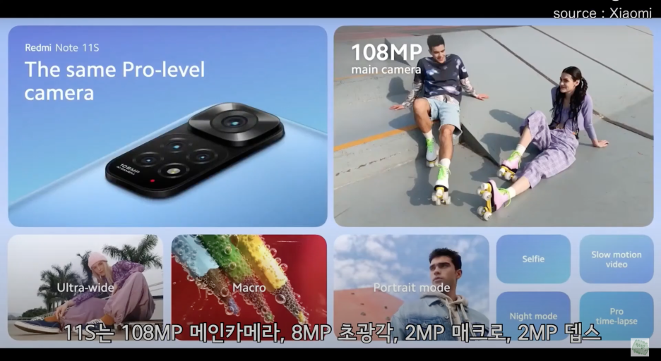 11S는 프로와 같은 108MP 메인카메라를 포함한 쿼드카메라입니다. 나머지는 8MP 초광각, 2MP 매크로 2MP 뎁스.