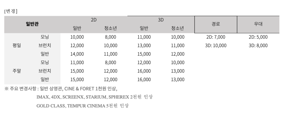 오는 4월 4일부터 CGV 모든 영화 관람료가 인상되는데, 일반 2D 영화는 1,000원이 올라 주중 14,000원, 주말 15,000원으로 인상됩니다. 아이맥스를 포함한 4DX, 스크린X 같은 특별관은 무려 2,000원이 인상되고, 골드클래스 같은 고급관은 5,000원이 인상됩니다.