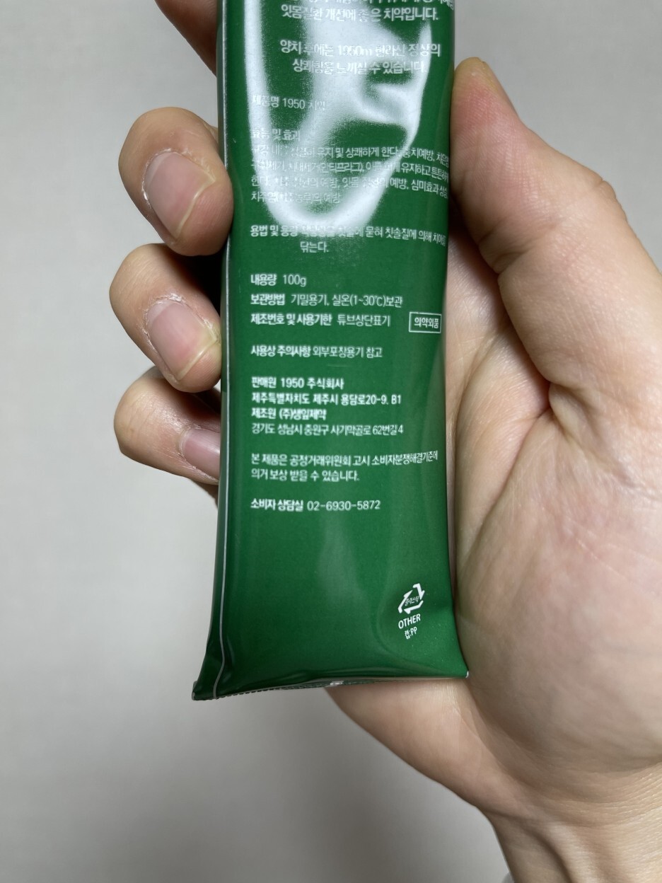 1950 치약은 풍치 치료나 구취제거에 활용되어온 다섯 가지 약초 (어성초, 녹차, 병풀, 금은화, 작약)의 추출물을 대한 약전 소금과 배합하여 만든 좋은 치약이라고 설명되어 있습니다. 마지막 멘트가 상당히 인상적인데요. 양치 후에는 1950m 한라산 정상의 상쾌함을 느낄 수 있다고 합니다.