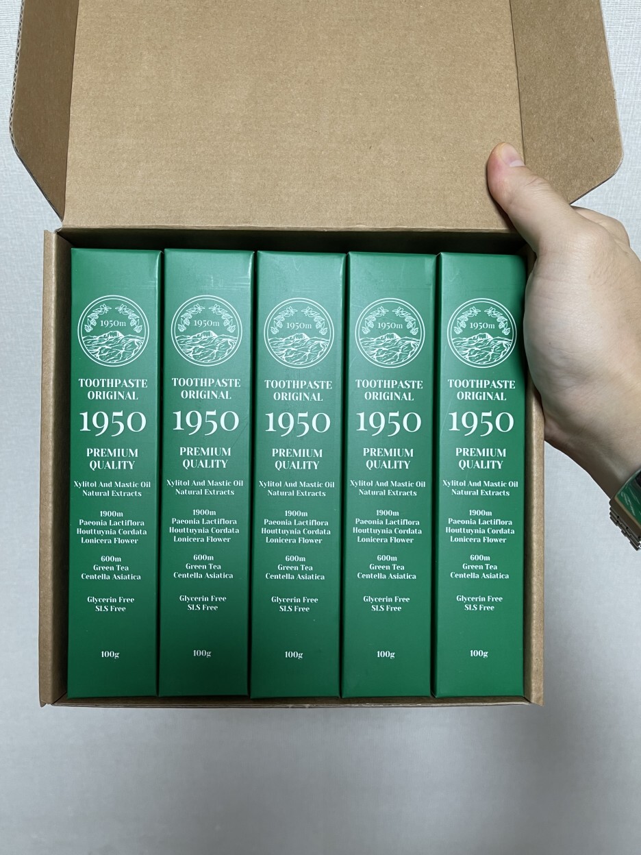 박스를 열면 치약이 가지런히 놓여 있습니다. 1950 제주에서 판매 중인 치약은 총 세 가지인데요. 저는 그중 가장 먼저 발매되었던 오리지널 버전을 구매했습니다.