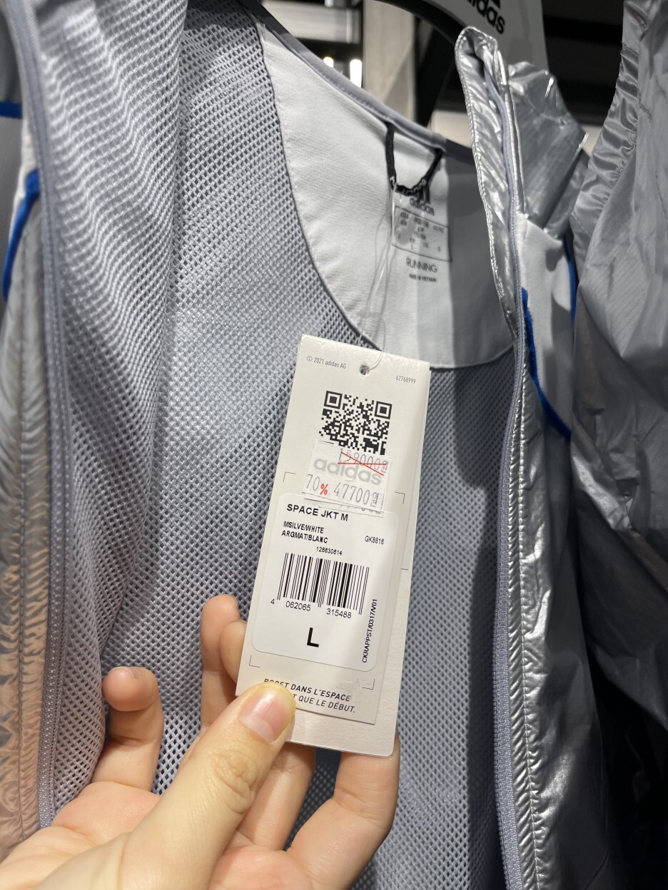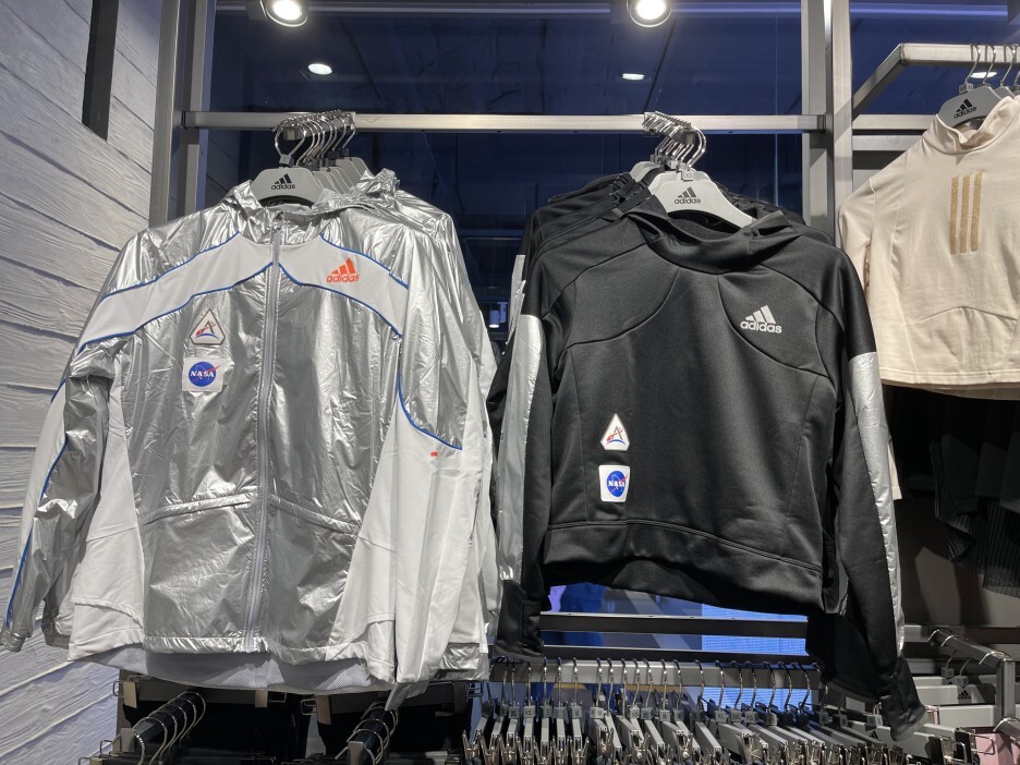그 와중에 매장을 들어가자마자 제 눈을 사로잡은 옷. 바로 아디다스와 나사가 콜라보한 재킷인데요. 디자인이 굉장히 사이버틱하네요. 감히 입을 엄두가 나지 않는 옷입니다.