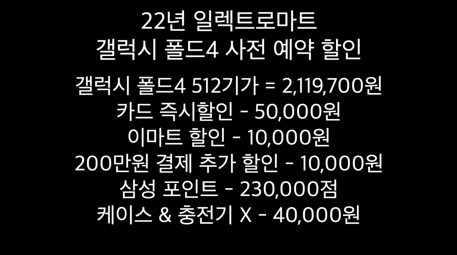 갤럭시 폴드4 512기가 출고가 211만 9천7백 원이었는데 여기에 카드 즉시할인 5만 원 들어가고, 이마트 만원 할인 쿠폰, 200만 원 결제 시 추가 만원 할인, 그리고 삼성 포인트 23만 점까지.