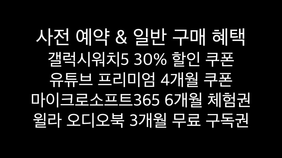 그리고 사전 예약과 일반 구매 모두 드리는 혜택은 갤럭시워치5 30% 할인 쿠폰, 유튜브 프리미엄 4개월 쿠폰, 마이크로소프트 365 6개월 체험권, 윌라 3개월 무료 구독권입니다.