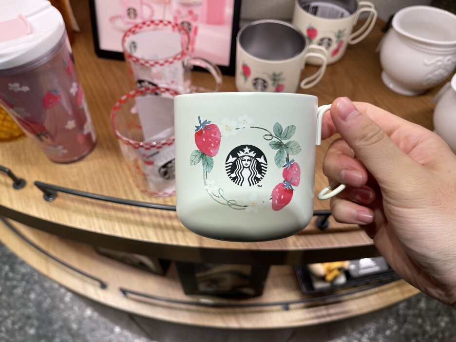 그리고 생그러운 딸기가 그려진 머그컵. 이 머그컵의 색깔이 흰색이 아니고 약간 초록빛이 띄는 게 너무 맘에 들어서 이 컵으로 바로 결정했습니다. 사실 제가 원하는 컵은 핑크빔이었는데 말이죠.