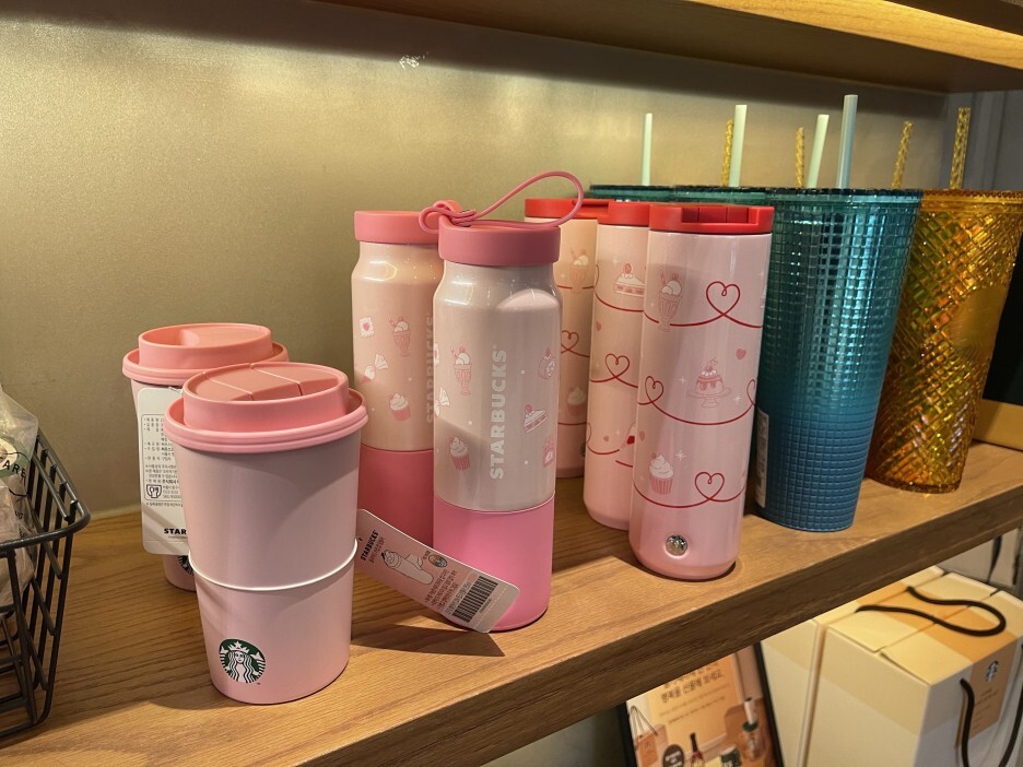 맛있는 디저트와 하트 그림이 새겨진 텀블러. 특이하게 밑부분에 스타벅스 로고가 징처럼 박혀 있네요.