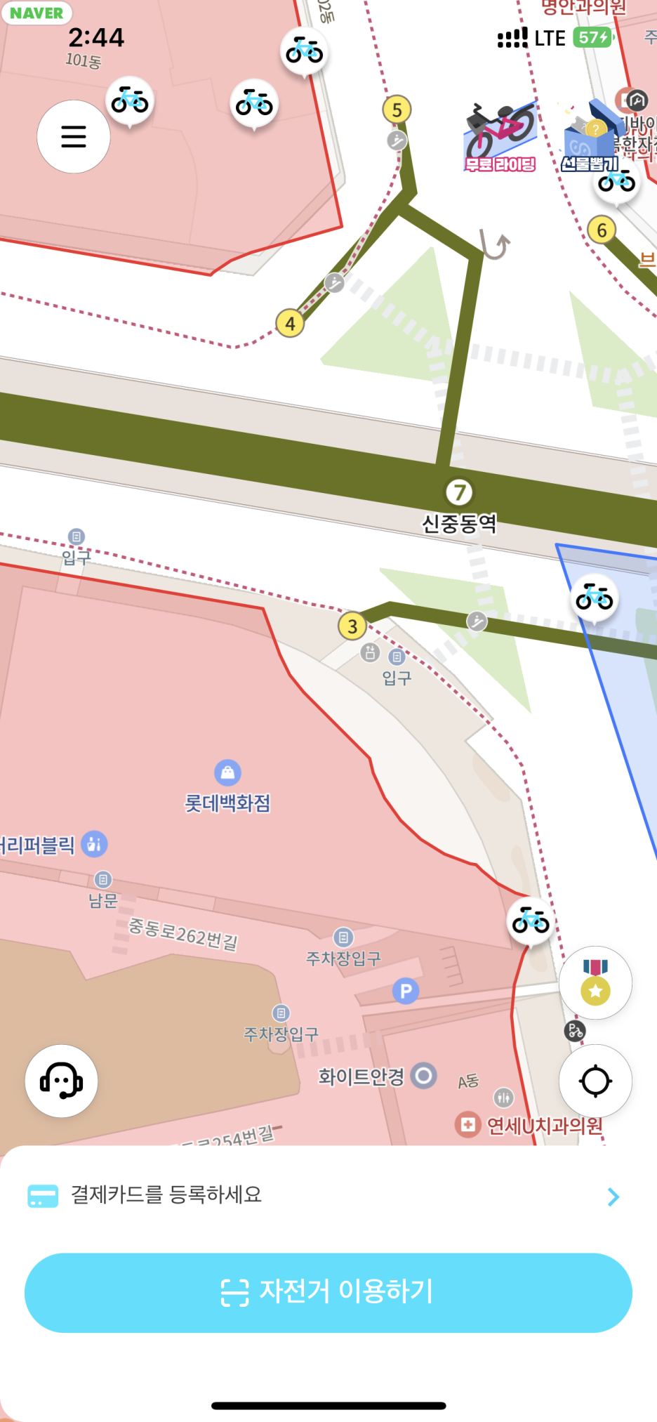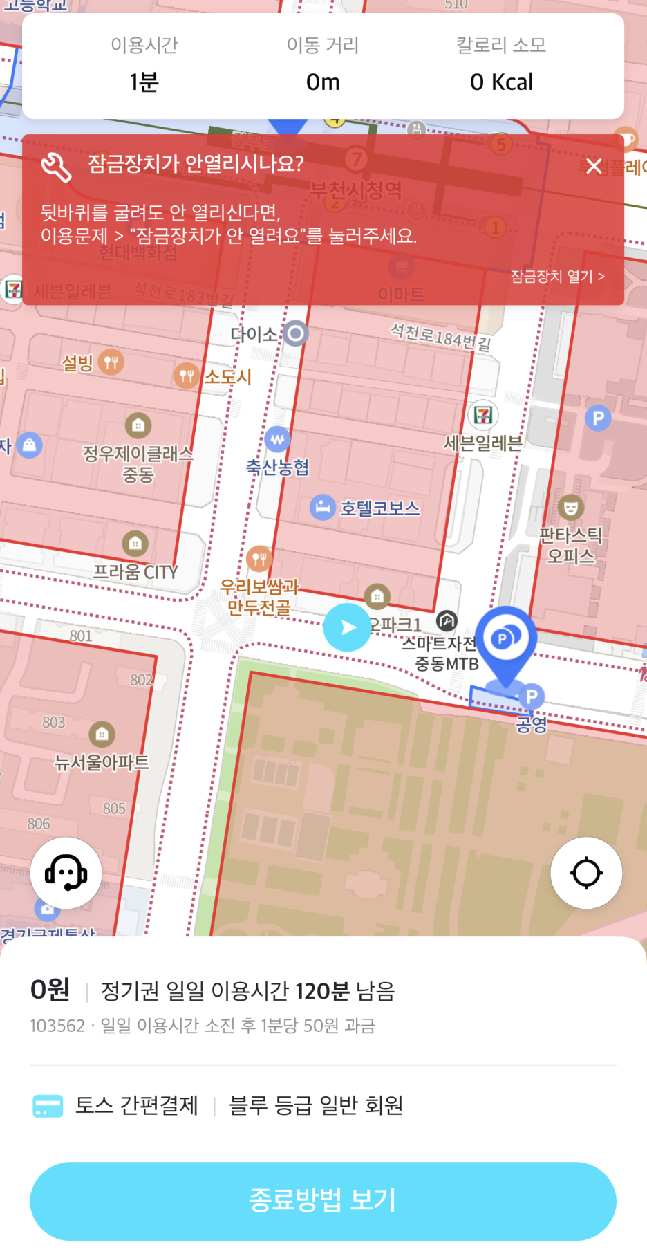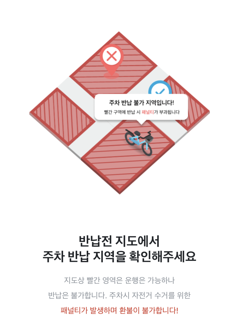 그리고 자전거는 빨간색 영역에 절대 주차하시면 안 됩니다. 빨간색에 주차하시면 페널티가 발생하고 추가 요금이 계속 나가요.