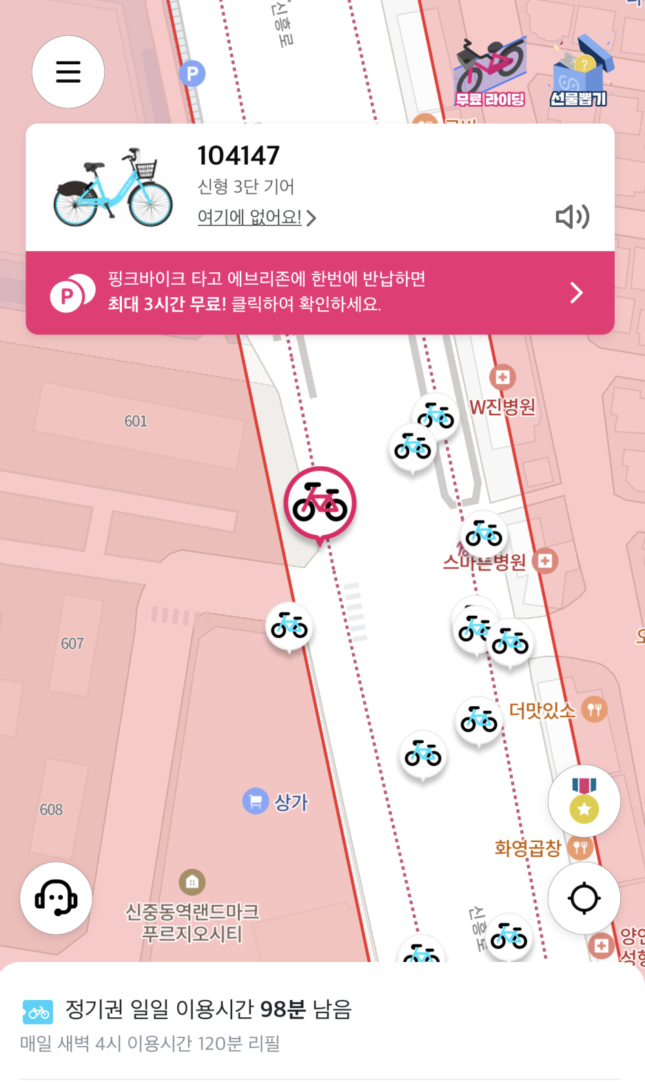 이번에는 핑크바이크, 그러니까 자전거를 무료로 타볼까요?! 일단 지도에서 핑크바이크를 찾아주세요.