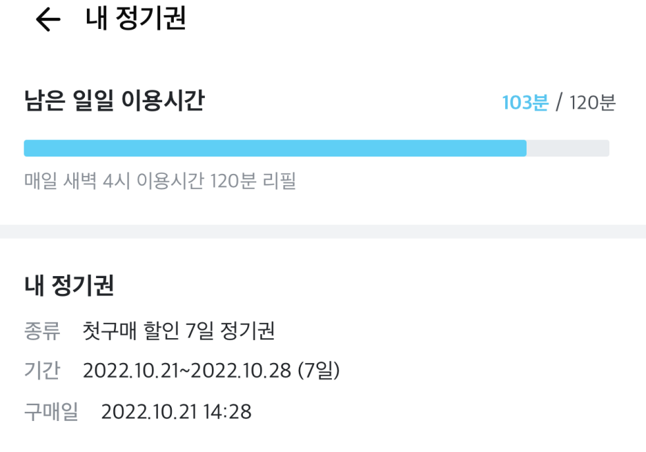 저처럼 정기권을 사용하셨다면 남은 일일 이용 시간도 확인할 수 있습니다. 참고로 정기권은 매일 새벽 4시에 리필되는 방식입니다.