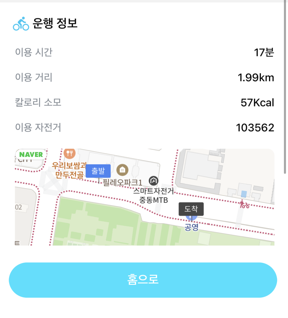이용 시간, 이용 거리, 칼로리 소모와 지도를 통해서 어디서 출발했고, 어디에 세웠는지도 확인할 수 있어요.