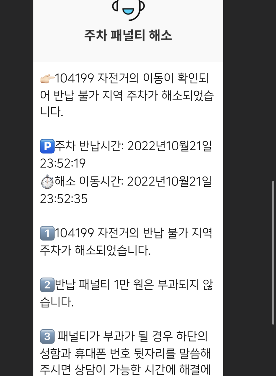 자전거를 반납 가능 지역에 주차하시면 다시 카톡으로 주차 패널티가 해소되었다는 메시지가 옵니다. 패널티 추가 요금은 10,000원이었네요. 덜덜덜;;;