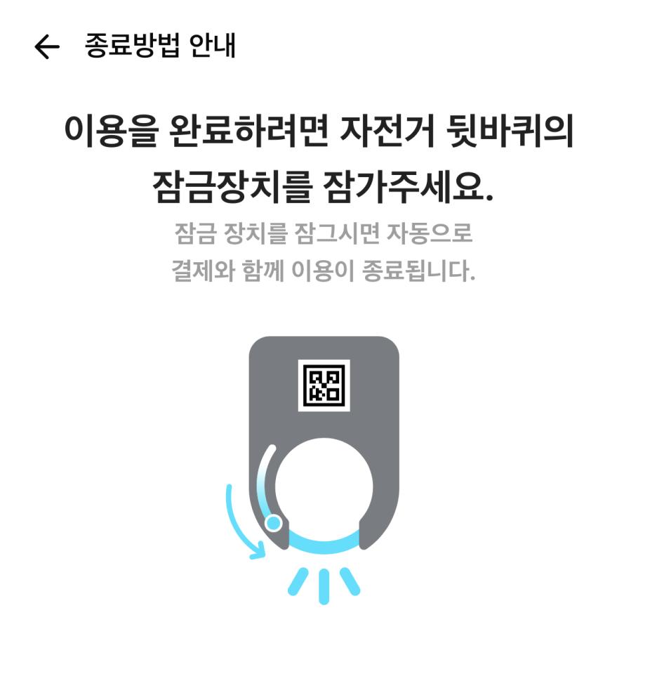 인식이 제대로 되었다면 스마트락이 알아서 풀립니다. 아까 말씀드렸다시피 만약 QR코드가 스캔 되었는데 스마트락이 풀리지 않는다면 자전거 뒷바퀴를 살짝 움직여보세요. 그럼 알아서 락이 풀립니다.