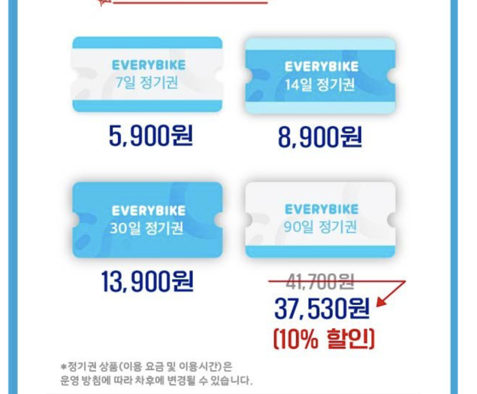 가격은 7일 5,900원, 30일 13,900원! 상당히 합리적인 가격이었습니다. 저도 원래 30일 정기권을 끊고 밤마다 잘 타고 다녔는데요.