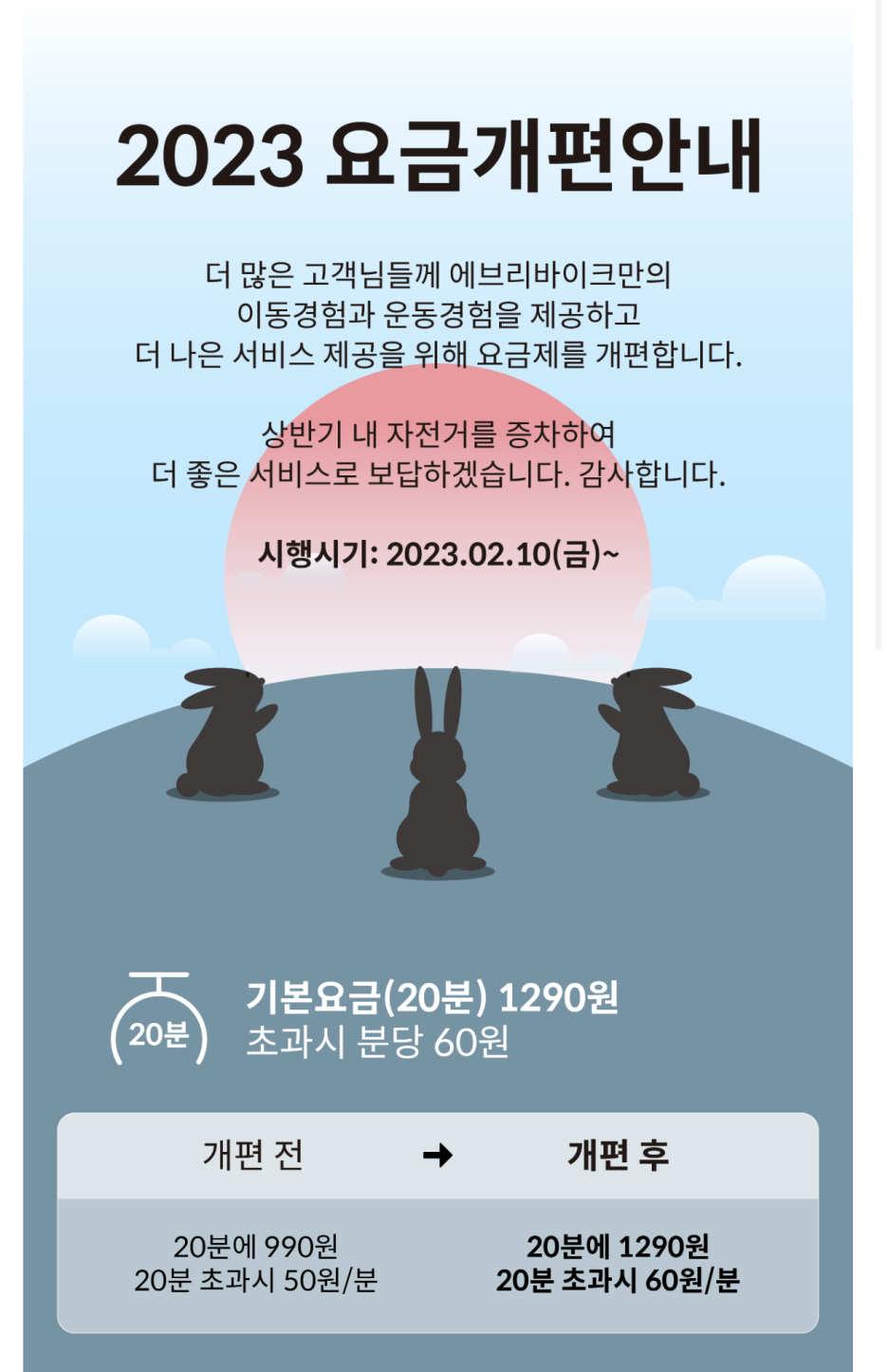 개인적으로는 갑작스러운 가격 인상에 전혀 메리트를 느끼지 못하고 있습니다. 기존에는 버스로 갈만한 거리는 무조건 에브리바이크를 타고 갔는데, 자전거 이용 요금이 버스 요금이랑 비슷해져서 굳이 내가 타야 되나?라는 생각이 드네요. 게다가 지하철과 환승도 되지 않으니 출퇴근 시간에 쓰기도 애매합니다.