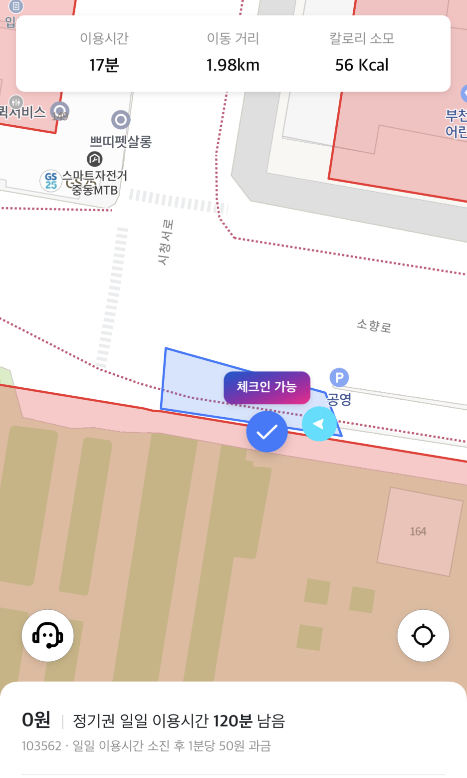 정상적으로 처리되었다면 어플 내에서 내 위치와 이용 시간, 이동 거리, 칼로리 소모를 확인할 수 있습니다.