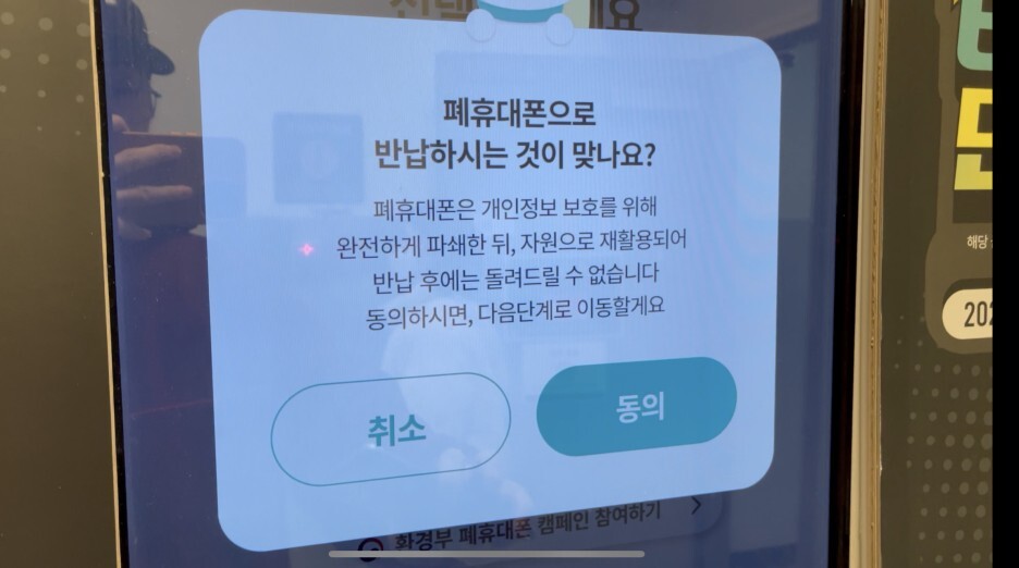 그럼 폐휴대폰을 반납하는 게 맞냐는 메시지가 뜹니다. 잘 읽어보시면 폐휴대폰은 개인정보 보호를 위해 완전하게 파쇄하고, 자원으로 재활용되기 때문에 반납을 하시면 다시 돌려받을 수 없습니다. 마음 바뀌어도 절대 돌려받을 수 없으니 신중하게 선택하세욧!!