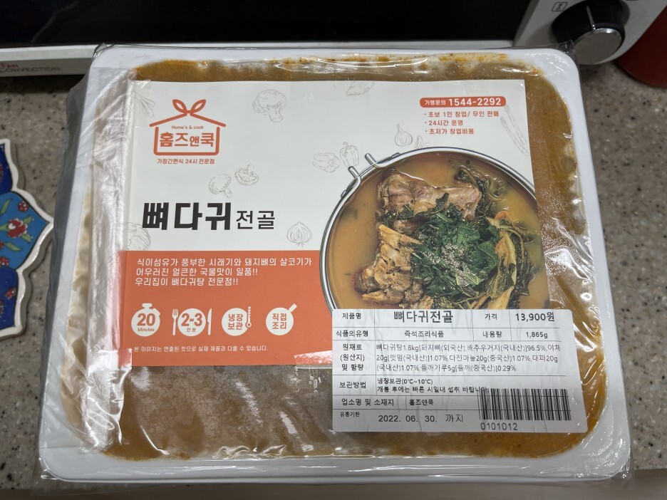 이게 홈즈앤쿡에서 사 온 뼈다귀전골인데요. 생각해 보니까 감자탕인 줄 알았는데 뼈다귀전골이네요. 가격은 13,900원이고, 2~3인분 정도의 양이라고 합니다.
