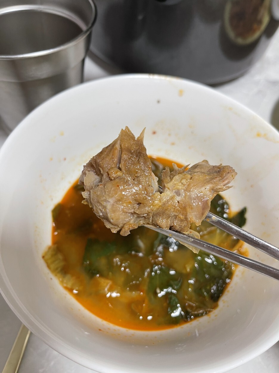 한참을 끓이고 깻잎까지 넣어서 이제 먹을 준비가 되었는데요. 일단 식당에서 먹는 감자탕과는 다른 점이 있습니다. 약간 밀키트 특유의 냄새라고 할까요. 좋은 것도 나쁜 것도 아닌데 그런 게 좀 느껴졌습니다.