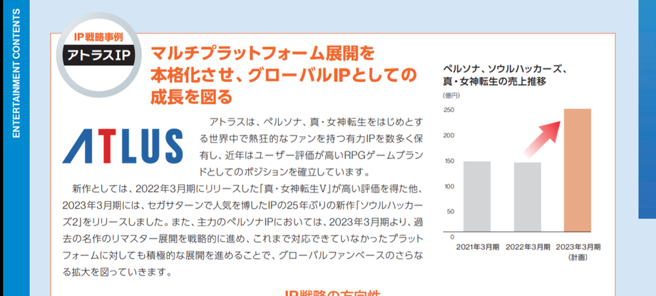 옆에 그래프를 보시면 페르소나, 소울해커즈, 진여신전생의 판매량 추이를 알 수 있는데요. 2021년, 2022년 3월에는 150억 엔 언저리라고 한다면, 2023년 3월부터는 250억 엔의 판매량을 계획하고 있다고 합니다.