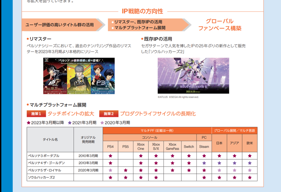 또 최근 세가가 공개한 자료에 따르면, 아틀라스 IP, 특히 페르소나 3, 4, 5가 멀티플랫폼으로 발매하면서 글로벌 IP로서 성장을 도모한다고 하는데요.
