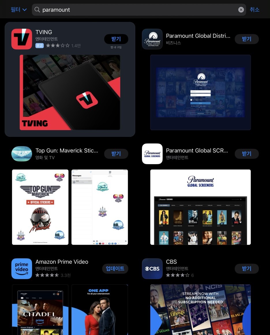 먼저 우리나라 앱스토어에서 paramount라고 검색을 하면 파라마운트 플러스 어플이 나오지 않습니다. 왜냐하면 우리나라 앱스토어에서는 받을 수 없기 때문입니다.