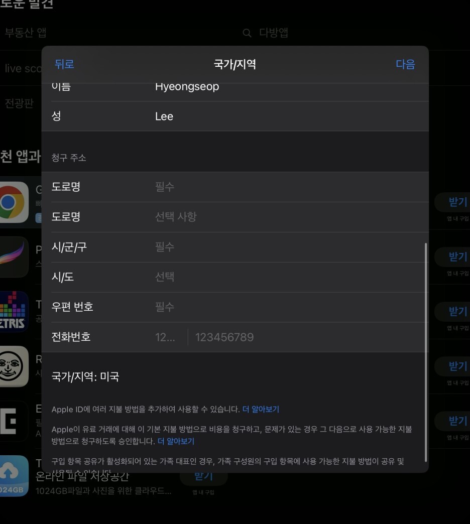 다음 미국 주소와 전화번호를 입력해야 하는데요. 우리는 미국에 살고 있지 않잖아요. 그러니까 아무 미국 주소와 전화번호를 넣으시면 되는데요. 가장 만만한 건 역시 애플 본사 주소입니다.