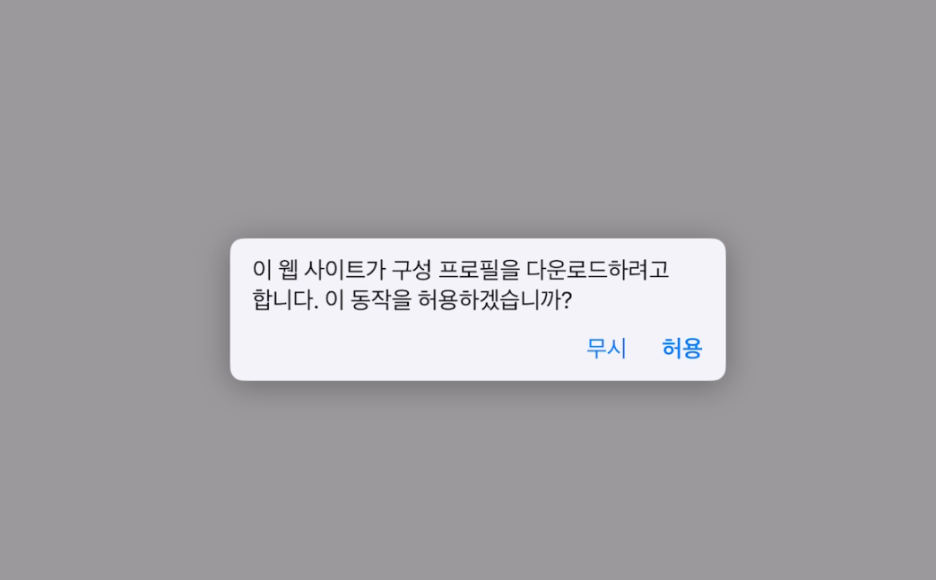 허용하시면 아이폰에 다운이 됩니다. 설치하는 방법은 '아이폰 설정 - 일반 - VPN 및 기기관리'에 가셔서 다운 받은 프로파일 설치하면 끝~
