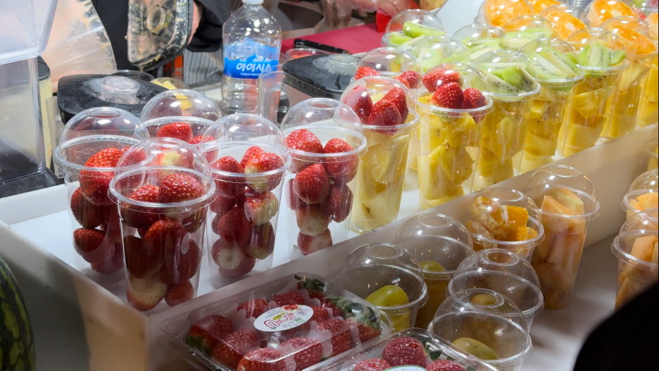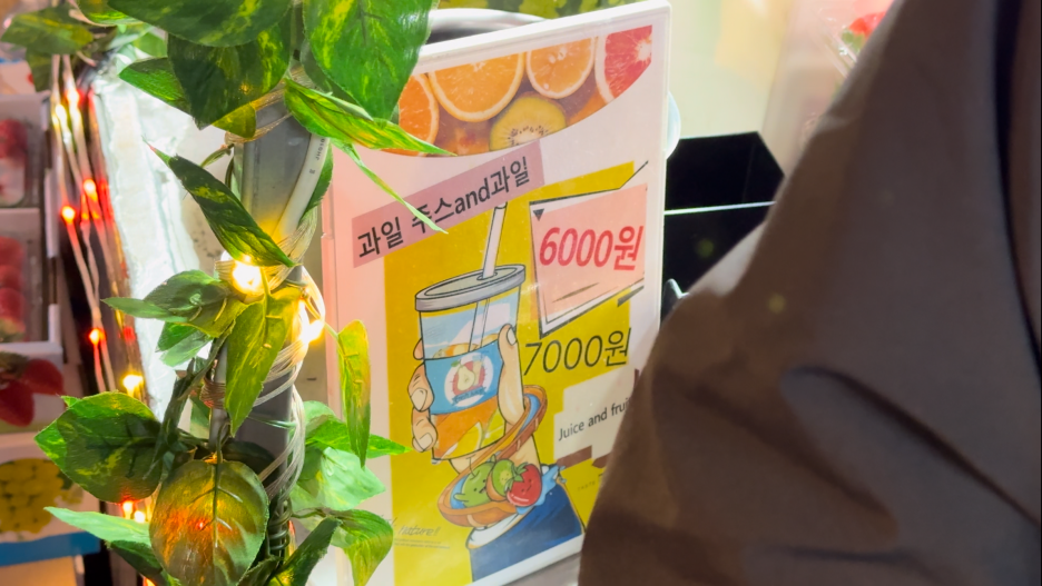 어쨌든 명동에서는 컵에 과일을 담아서 팔기도 하고, 생과일주스로 직접 갈아서 팔고 있습니다.