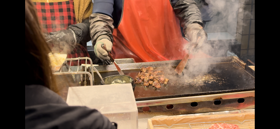 철판에 구워주는 스테이크 무조건 맛있습니다. 소고기 굽는 냄새가 코를 찌르는데 저녁을 먹었음에도 군침이 돌아 참느라 혼났습니다. 한 접시 만 오천 원. 이거 하나 먹으면 배불러서 다른 음식은 못 먹을 듯?!