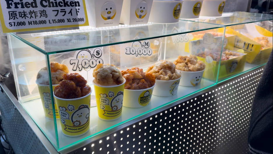 한국을 찾는 외국인이 가장 기대하는 음식 중 하나인 치킨! 컵으로 팔고 있는데요. 가장 작은 사이즈 7천 원부터 모시고 있습니다. 흐읍... 명동에 BHC가 있긴 한데...