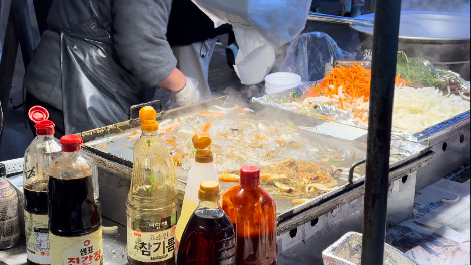 잡채. 저도 잡채 참 좋아하는데요. 본디 잡채는 엄마가 만든 게 제일 맛있는 건데 즉석에서 이렇게 만드는 잡채도 참 먹음직스러웠습니다. 한 접시 5천 원. 이게 바로 한국 전통 음식 아니겠습니까!