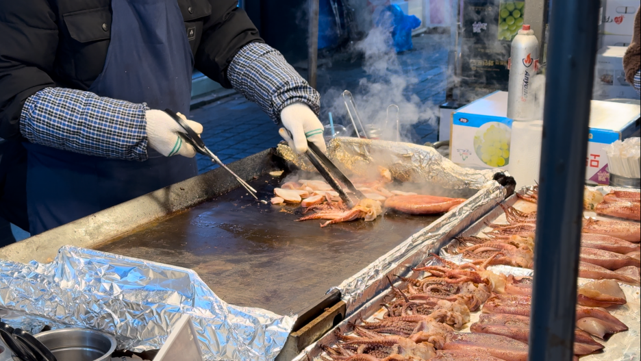 이야 철판 오징어 구이! 오징어를 철판에 바로 구워주는데 이건 냄새가 정말 죽였습니다. 지나치기 정말 어려울 정도로 오징어 굽는 냄새가 명동 전역에 퍼졌습니다.