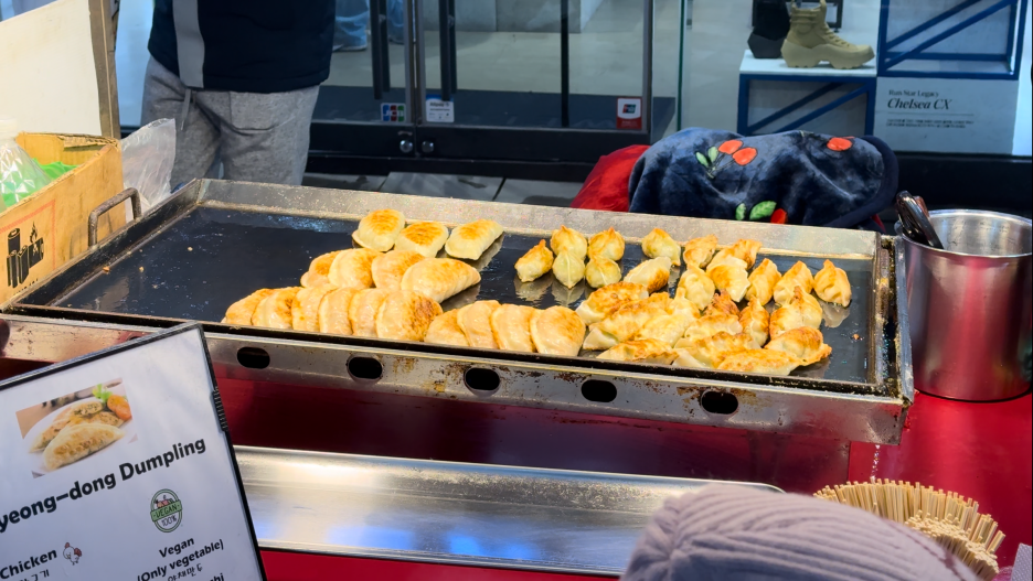명동 교자! 3개 5천 원. 명동 교자라는 유명한 칼국숫집이 있긴 한데 그거랑 전혀 상관없는 군만두입니다. 군만두가 3개 5천 원... 조금 주저하게 되는 가격인뎅...