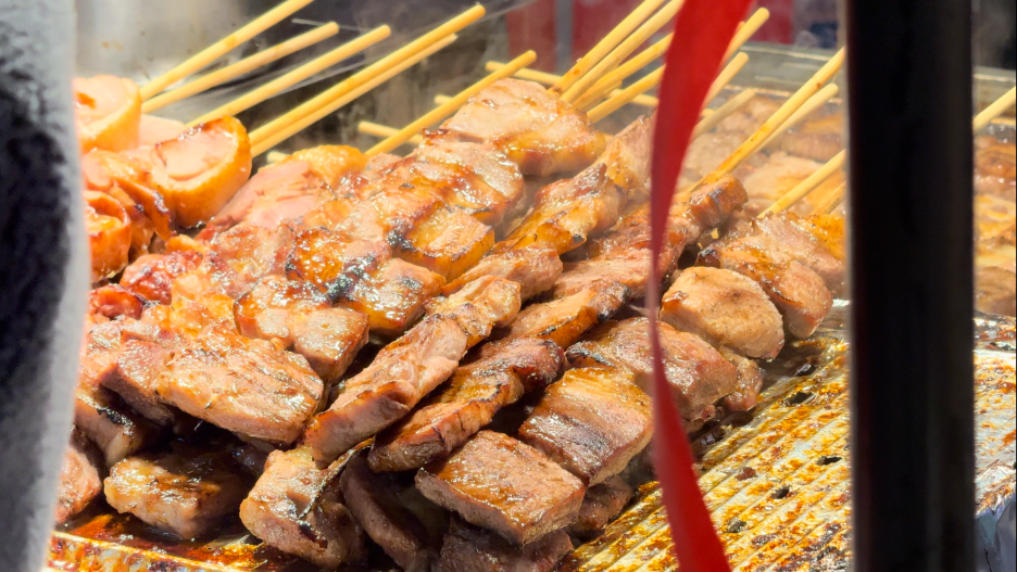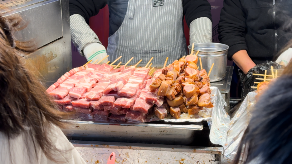 여기는 꼬치 시리즈인데요. 지금 보시는 건 삼겹살꼬치와 오리꼬치입니다. 무엇보다도 닭꼬치마냥 조그만 게 아니고 크기가 엄청나게 큽니다. 가격은 1개 8천 원인데요. 크기를 생각하면 나름 합리적으로 보입니다.