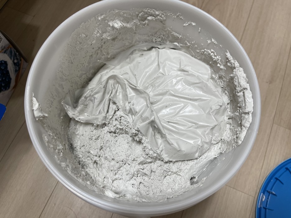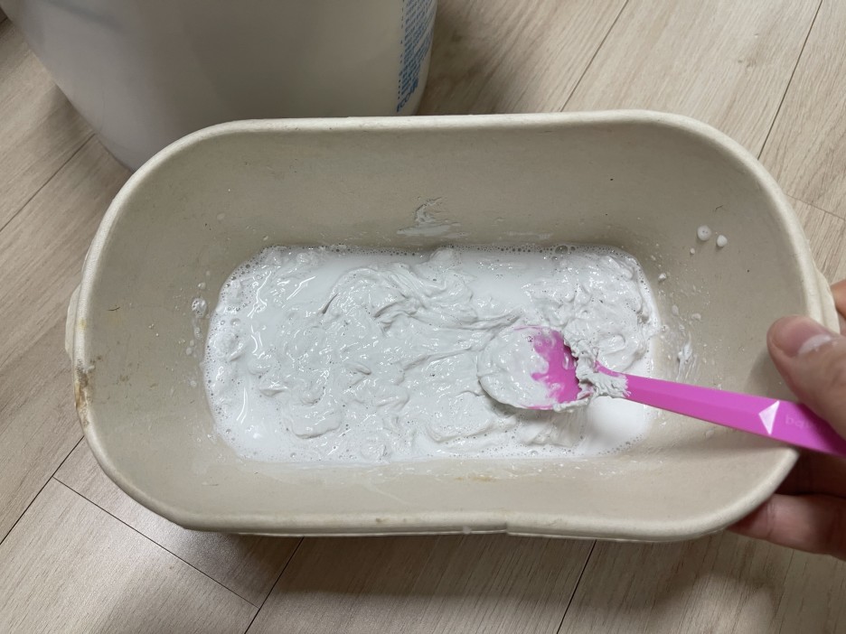 퍼티와 물을 잘 섞어 주시면 사진에서 보는 것처럼 흐물흐물해집니다. 이제 벽에 잘 발라주시면 됩니당.