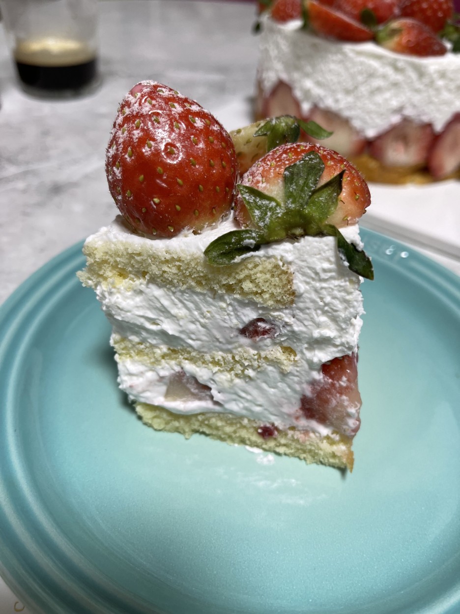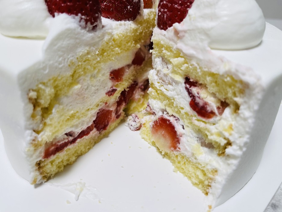 케이크 안쪽을 좀 더 자세히 볼까요. 안쪽 깊숙이 딸기가 들어 있어요. 그래서 케이크 먹을 때마다 딸기가 씹혀요.