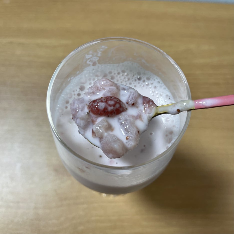 라뗴 안에 가득 찬 딸기가 보이시나요?! 딸기가득라떼 이름에 걸맞게 딸기가 가득 차 있습니다.