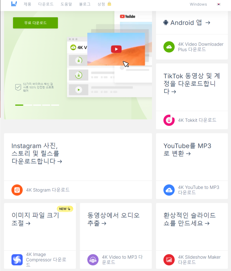 홈페이지에 방문하시면 4K Video Downloader 이외에도 여러 어플이 있습니다. 인스타그램 사진, 릴스를 받을 수 있는 프로그램부터 유튜브 영상, 음원은 MP3로 변환하는 프로그램 등등... 필요하신 프로그램이 있다면 무료로 다운로드할 수 있습니다.