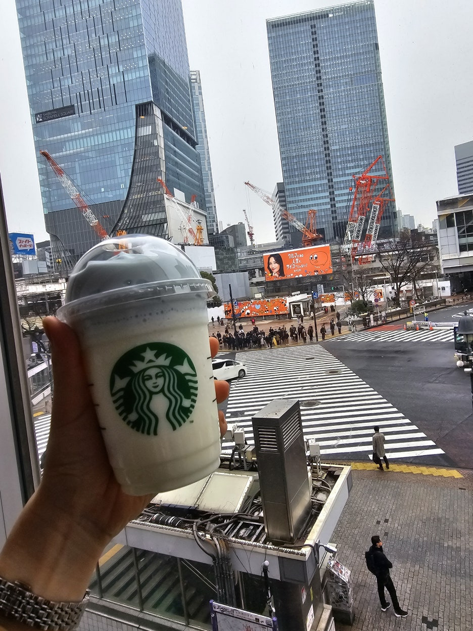 주문한 음료랑도 사진 찍어보고... 참고로 시부야 스타벅스는 무조건 1인 1음료를 주문하셔야 창가 자리에 앉으실 수 있어요.