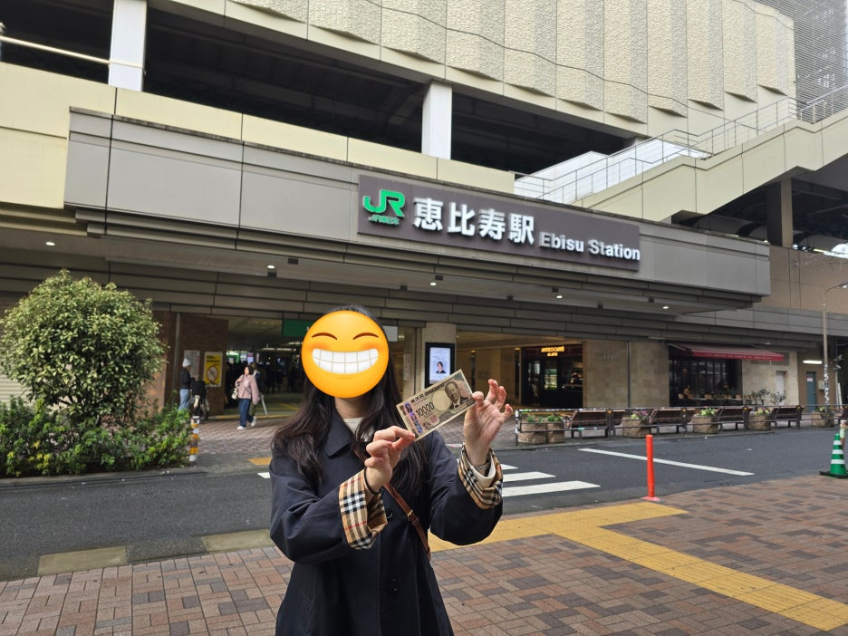 숙소가 롯폰기였는데 시부야까지 한방에 가는 기차가 없어서 중간에 에비스에 내려 사진 한 장 남겨보았습니다. 이번에 일본 화폐가 새로 나왔다길래 같이 찍었어요.