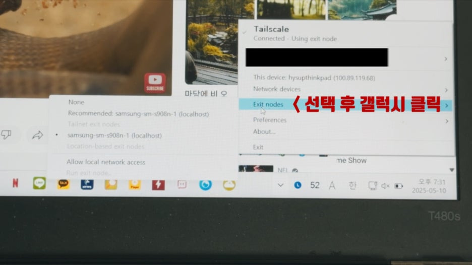 그다음 다시 윈도우 노트북으로 돌아가 Tailscale 프로그램 오른쪽 버튼 누르시고 Exit nodes 누르시면 사진처럼 왼쪽에 뭔가 뜰 겁니다. 여기서 갤럭시를 선택해 주세요.