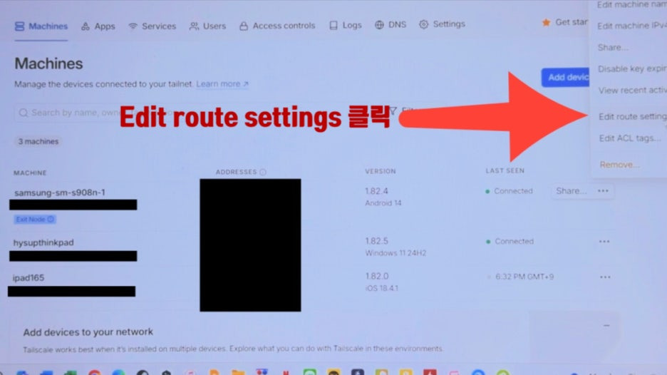 그럼 이런 화면이 뜨는데요. 여기서 Tailscale에 연결된 기기를 확인하실 수 있습니다. 일단 여기서 무얼 보냐면...